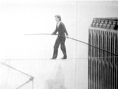Siempre me ha fascinado la figura del funambulista, como la del torero, como la del poeta, como la del padre, como la del místico. Cuando, hace unas semanas, encontré el Traité du funambuliste (Actes Sud, 1997) de Philippe Petit (en la foto), no dudé en comprarlo. Lo abrí, y leí la siguiente advertencia al lector: No, la cuerda no es aquello que nos imaginamos. No es el universo de la ligereza, del espacio, de la sonrisa. Es una tarea. Sobria, ruda, decepcionante. Y el que no desee llevar a cabo una lucha encarnizada, plena de esfuerzos inútiles, de peligros profundos, de trampas, quien no esté dispuesto a ofrecerlo todo, a cambio de sentirse vivo, ese no tiene necesidad de hacerse funambulo. Además, no podrá serlo. En cuanto a este libro, el estudio de la cuerda no es nada riguroso. Sería inútil. He devorado el libro, y marcado una centena de sus páginas. Paul Auster, en el prólogo, cuenta que se encontró a Petit, en 1971, actuando en una calle de París: Al contrario de lo que ocurre con tantos artistas callejeros, él no se dirigía a la gente. Más bien, parecía que hubiera autorizado al público a asistir al desarrollo de su pensamiento, habernos dado acceso, al fondo de sí mismo, a una obsesión inarticulada. Pero no había nada abiertamente personal en lo que hacía. Todo se revelaba como una metáfora, como en un segundo grado, por la mediación de la representación.
